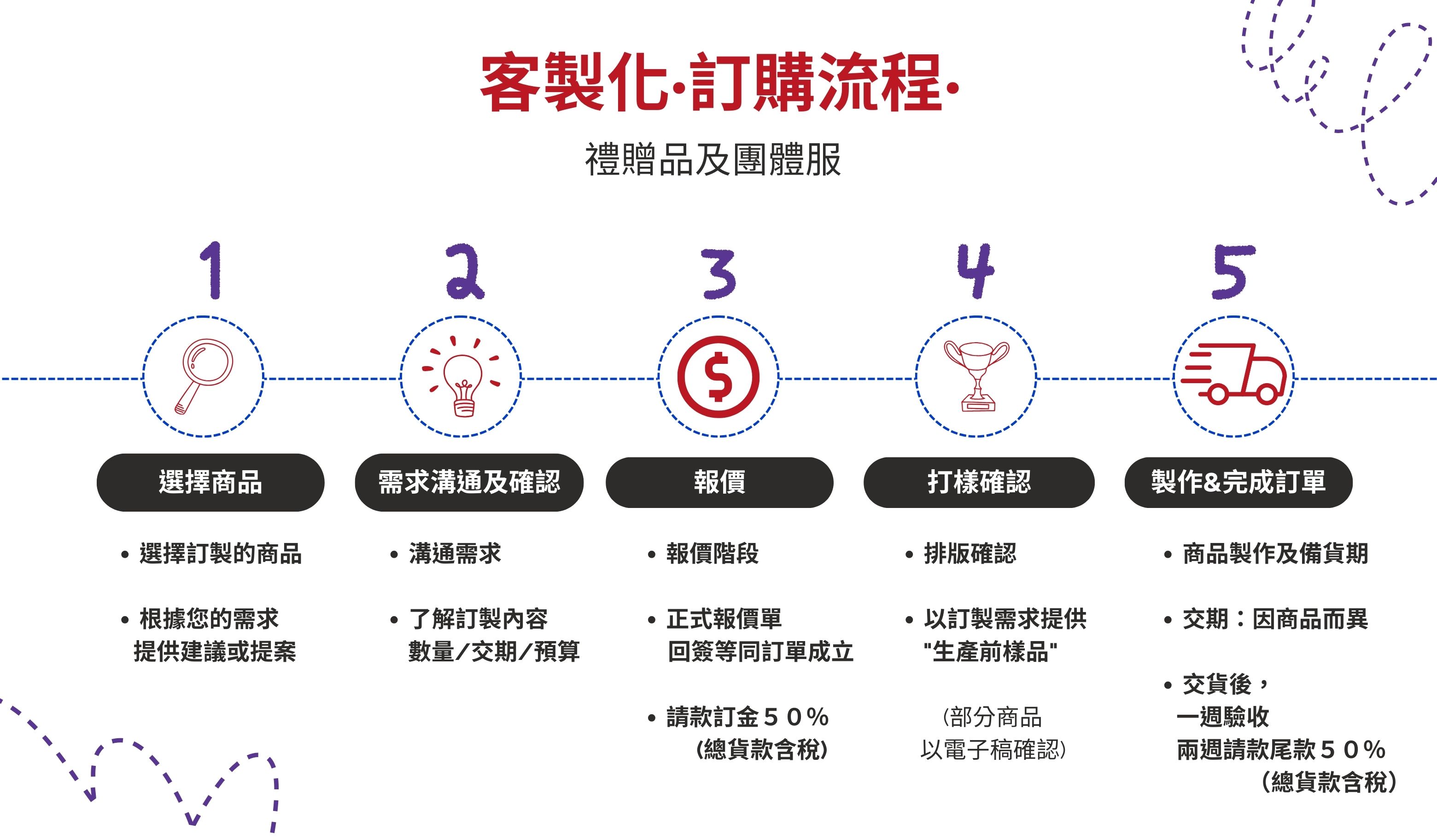 - 訂單成立,將於收取50%訂金後,並僅提供一次生產前樣品/電子校稿方式做確認,後續異動將於生產時做修正調整。